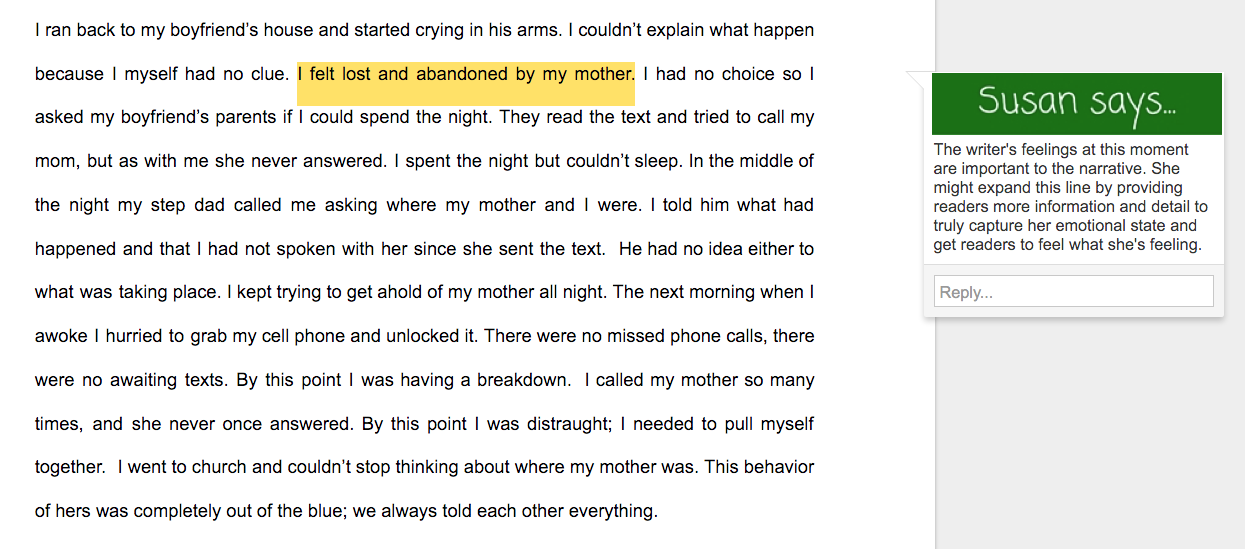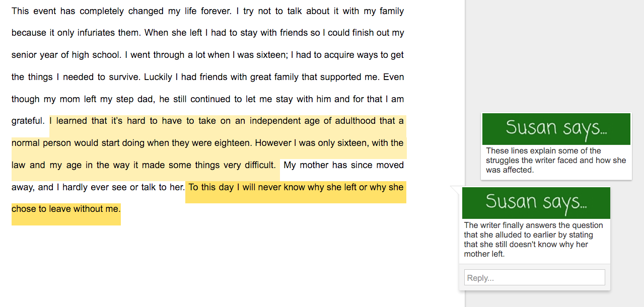 I’ve added comments throughout each narrative essay example to point out key features of the narrative and to illustrate what the writer does well.