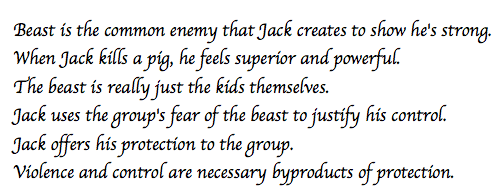 Then I’d include some supports with direct quotes from the book. I would, of course, have already marked off these quotes during my study time with sticky notes that say “beast” or “Jack”: