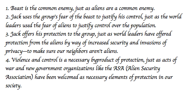 In our sample essay, according to the prompt, I need to correlate Jack and his beast with a real-life fear that is used to control a real-life society. I don’t want to start a political discussion in this blog post, so I’m going to use a fake idea having to do with an alien invasion. Don’t worry; none of this is true… yet.