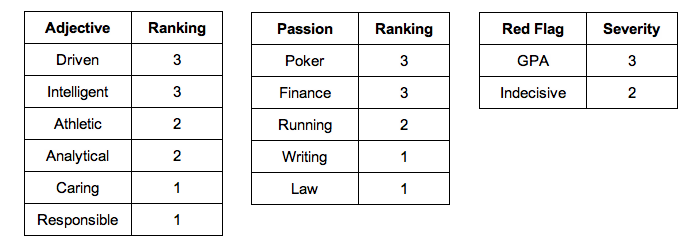 Here are my lists of descriptive adjectives, passions, and red flags: